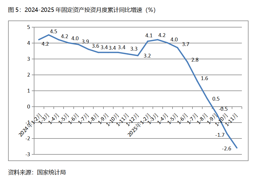 四、零售增速持續(xù)回落。11月份,社會消費品零售總額同比增長1.3%,比10月份增長2.9%回落了1.6個百分點,10月份比9月份增長3.0%回落了0.1個百分點,其中,餐飲收入和商品零售額增速均出現(xiàn)了回落,10月份餐飲收入同比增長3.2%,比10月份增長3.8%回落了0.6個百分點;商品零售額增長1.0%,比10月份增長2.8%回落1.8個百分點。社會消費品零售總額增速的持續(xù)回落,需要引起高度關(guān)注。