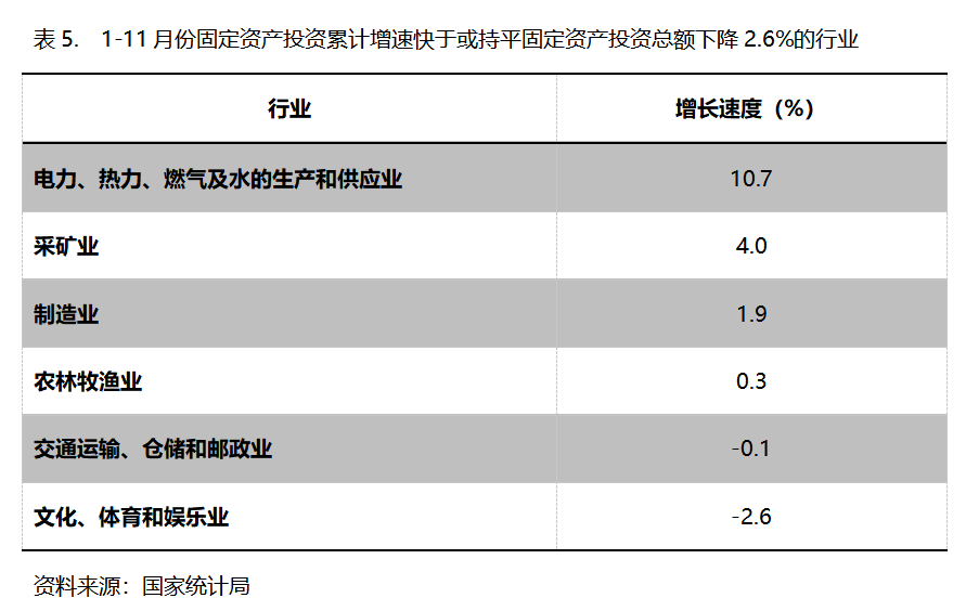 1-11月份,固定資產(chǎn)投資累計增速快于或持平固定資產(chǎn)投資總額下降2.6%的行業(yè)共6個,即電力、熱力、燃氣及水的生產(chǎn)和供應(yīng)業(yè)增長10.7%,采礦業(yè)增長4.0%,制造業(yè)增長1.9%。農(nóng)林牧漁業(yè)增長0.3%,交通運輸、倉儲和郵政業(yè)下降0.1%,文化、體育和娛樂業(yè)下降2.6%。