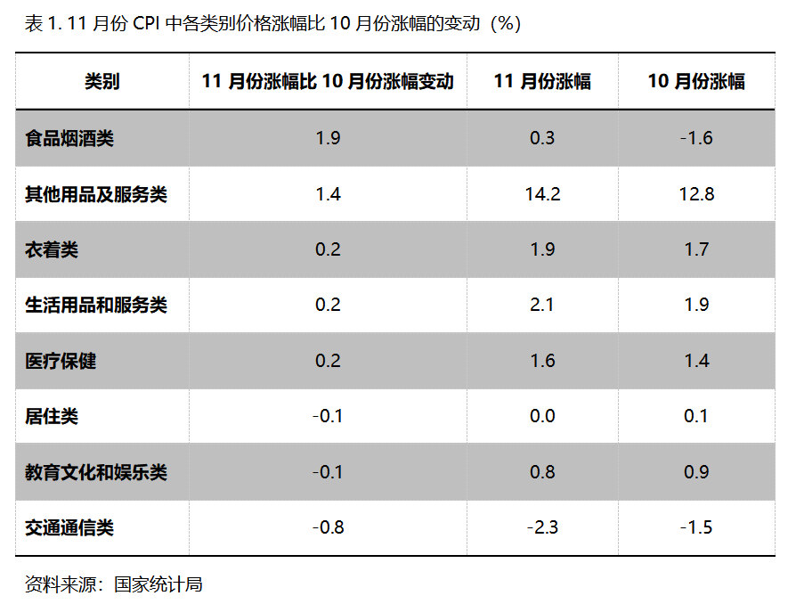 11月份,在CPI 8個類別中有5個類別同比漲幅回升,3個類別回落。漲幅回升的5個類別包括食品類價格由降轉(zhuǎn)漲、漲幅回升1.9個百分點,其他用品和服務(wù)類漲幅回升1.4個百分點,衣著類、生活用品及服務(wù)類和醫(yī)療保健類漲幅均回升0.2個百分點;居住類、教育文化和娛樂類漲幅均回落0.1個百分點,交通通訊類降幅擴大0.8個百分點。