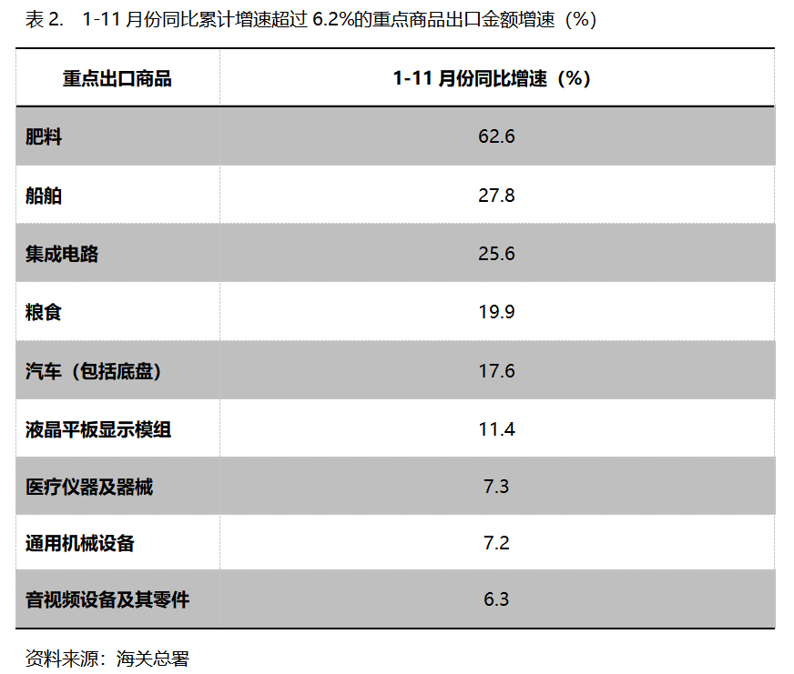 1-11月份,出口金額同比增速超過6.2%的重點商品共有9類,即肥料出口增長62.6%,船舶增長27.8%,集成電路增長25.6%,糧食增長19.9%,汽車(包括底盤)增長17.6%,液晶平板顯示模組增長11.4%,醫(yī)療儀器及器械增長7.3%,通用機器設(shè)備增長7.2%,音視頻設(shè)備及其零件增長6.3%。