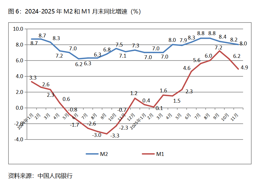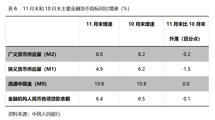 六、M2增速持續(xù)回落。11月末,廣義貨幣供應(yīng)量(M2)同比增長8.0%,比10月末增長8.2%回落0.2個百分點,10月末增幅比9月末增長8.4%回落0.2個百分點;狹義貨幣供應(yīng)量(M1)同比增長4.9%,比10月末增長6.2%回落1.3個百分點,10月末增幅比9月末增長7.2%回落1.0個百分點;流通中貨幣(M0)同比增長10.6%,與10月末增長10.6%持平,10月末增幅比9月末增長11.5%回落0.9個百分點。11月份末,M2增速已連續(xù)3個月回落,M1增速已連續(xù)2個月回落,M0由回落轉(zhuǎn)為持平。
