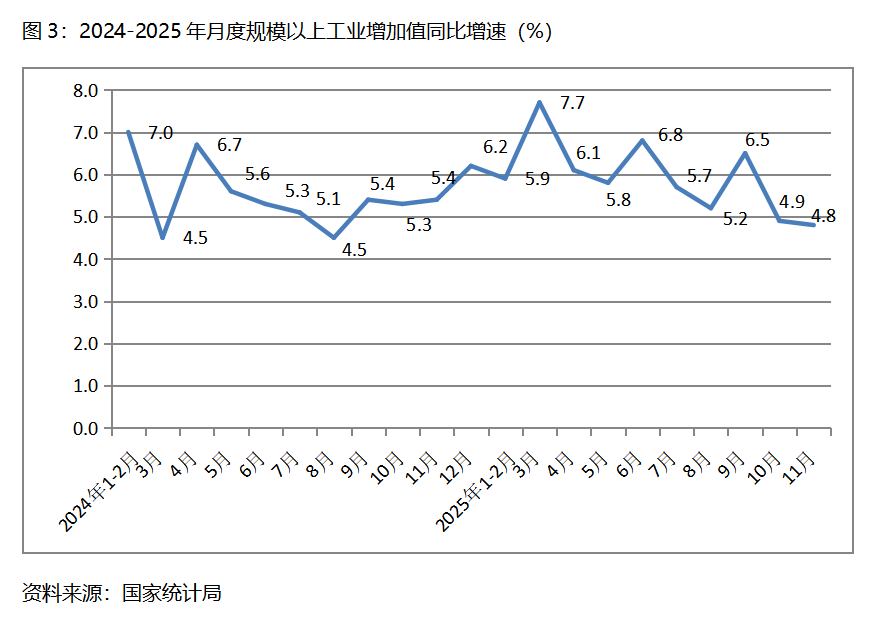 三、工業(yè)增速持續(xù)回落。11月份,規(guī)模以上工業(yè)增加值同比增長4.8%,比10月份增長4.9%回落了0.1個百分點,10月份比9月份增長6.5%回落了1.6個百分點。從工業(yè)三大門類看,采礦業(yè)增速比上月回升,制造業(yè)和電力、熱力、燃氣及水生產(chǎn)和供應(yīng)業(yè)增速回落,11月份,采礦業(yè)同比增長6.3%,比上月增長4.5%回升1.8個百分點;制造業(yè)增長4.6%,比上月增長4.9%回落0.3個百分點;電力、熱力、燃氣及水生產(chǎn)和供應(yīng)業(yè)增長4.3%,比上月增長5.4回落1.1個百分點。