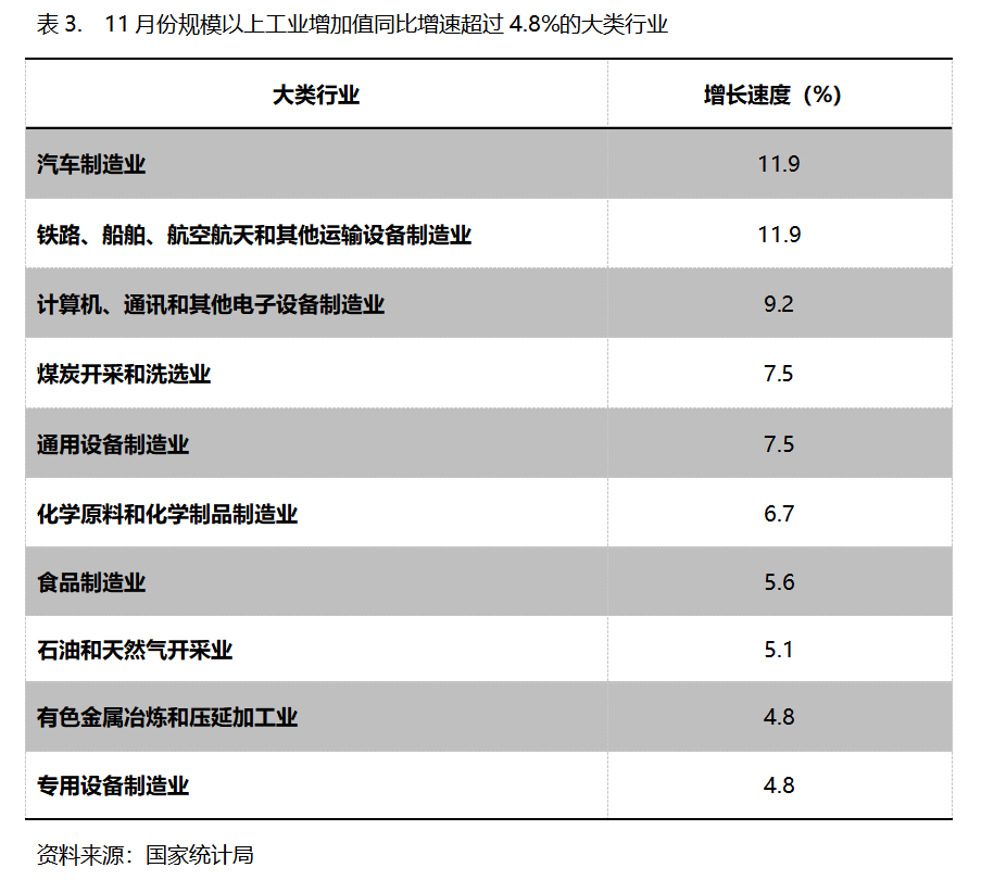 11月份,增長速度超過或持平規(guī)模以上工業(yè)增長4.8%的主要大類行業(yè)共有10個,即汽車制造業(yè)同比增長11.9%,鐵路、船舶、航空航天和其他運輸設(shè)備制造業(yè)增長11.9%,計算機、通訊和其他電子設(shè)備制造業(yè)增長9.2%,煤炭開采和洗選業(yè)增長7.5%,通用設(shè)備制造業(yè)增長7.5%,化學原料和化學制品制造業(yè)增長6.7%,食品制造業(yè)增長5.6%,石油和天然氣開采業(yè)增長5.1%,有色金屬冶煉和壓延加工業(yè)增長4.8%,專用設(shè)備制造業(yè)增長4.8%。