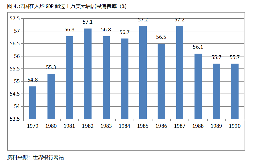 法國在人均GDP超過1萬美元后的12年期間,居民消費(fèi)率一直保持在54.0%以上,同時(shí)也呈現(xiàn)出先提高后回落總體穩(wěn)定的趨勢(shì)。法國在1979年人均GDP超過1萬美元,當(dāng)年居民消費(fèi)率為54.8%,1985提高到57.2%,隨后又有所回落,1990年為55.7%,也就是說,法國在人均GDP超過1萬美元后的12年期間,居民消費(fèi)率由當(dāng)年的54.8%提高到1985年最高的57.2%,共提高了2.4個(gè)百分點(diǎn)。