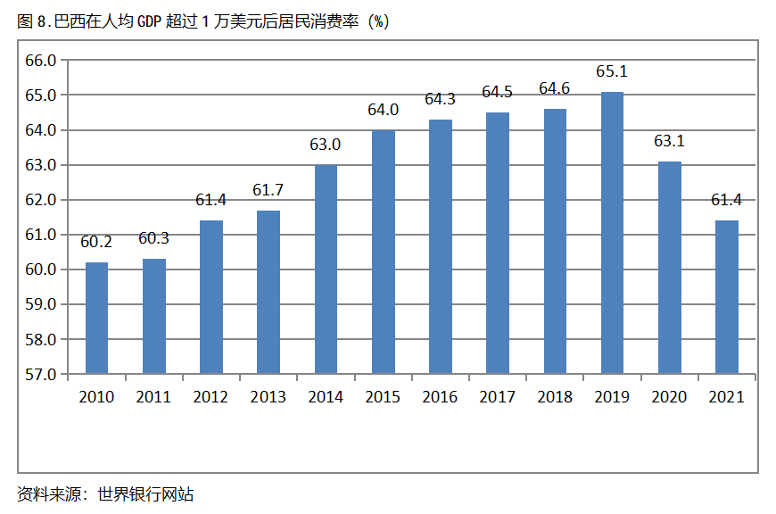 巴西在人均GDP超過1萬美元后的12年期間,居民消費(fèi)率基本上保持在60.0%以上,也呈現(xiàn)出較長時(shí)間的提高,但后兩年也出現(xiàn)小幅的回落。巴西在2010年人均GDP超過1萬美元,當(dāng)年居民消費(fèi)率為60.2%,2019提高到65.1%,隨后兩年出現(xiàn)回落,2021年為61.4%,也就是說,巴西在人均GDP超過1萬美元后的12年期間,居民消費(fèi)率由當(dāng)年的60.2%提高到2019年最高的65.1%,共提高了4.9個(gè)百分點(diǎn)。