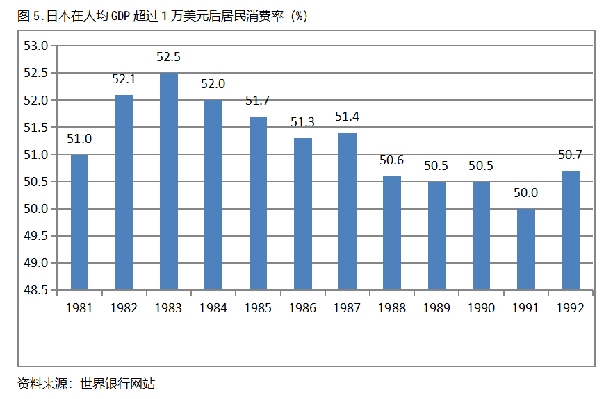 日本在人均GDP超過1萬美元后的12年期間,居民消費(fèi)率一直保持在50.0%以上,同時(shí)也呈現(xiàn)出先提高后回落總體穩(wěn)定的趨勢(shì)。日本在1981年人均GDP超過1萬美元,當(dāng)年居民消費(fèi)率為51.0%,1983提高到52.5%,隨后又有所回落,1992年為50.7%,也就是說,日本在人均GDP超過1萬美元后的12年期間,居民消費(fèi)率由當(dāng)年的51.0%提高到1983年最高的52.5%,共提高了1.5個(gè)百分點(diǎn)。