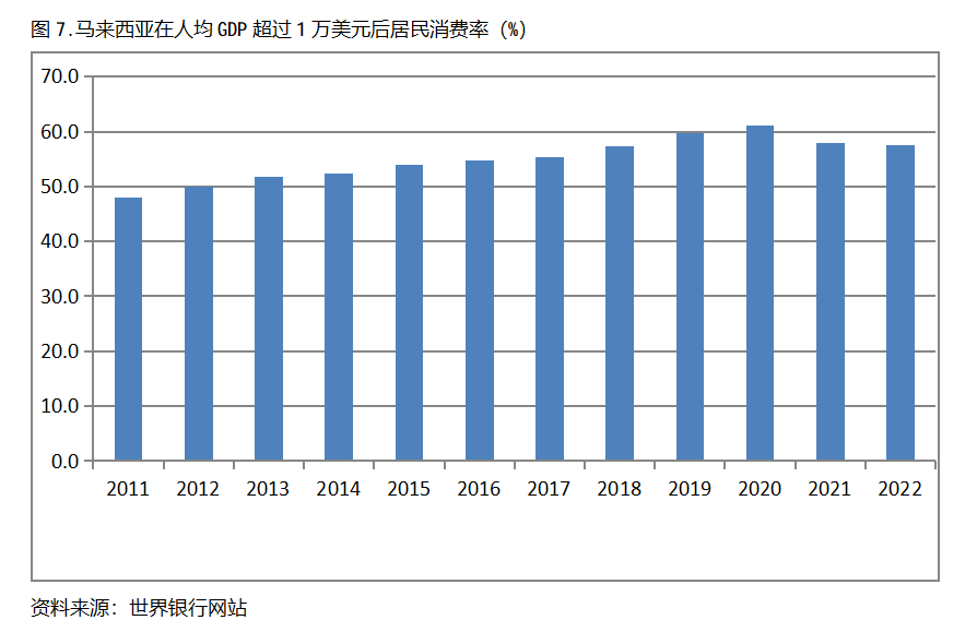 馬來西亞在人均GDP超過1萬美元后的12年期間,居民消費(fèi)率基本上保持在50.0%以上,也呈現(xiàn)出較長時(shí)間的提高,但后幾年也出現(xiàn)小幅的回落。馬來西亞在2011年人均GDP超過1萬美元,當(dāng)年居民消費(fèi)率為48.0%,2020提高到61.0%,隨后出現(xiàn)回落,2022年為57.6%,也就是說,馬來西亞在人均GDP超過1萬美元后的12年期間,居民消費(fèi)率由當(dāng)年的48.0%提高到2020年最高的61.0%,共提高了13.0個(gè)百分點(diǎn)。