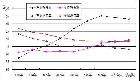 我們可以看看,從2003年到2012年這十年,實(shí)際上東北很多問題并沒有真正解決,比如投資率、消費(fèi)率比嚴(yán)重扭曲,東北比全國要嚴(yán)重的多。三省投資率由2003年的37.3%上升至2011年的63.1%,提高了25.8個(gè)百分點(diǎn),而同期全國由41%增長到48.3%,提高了7.3個(gè)百分點(diǎn);消費(fèi)率由53.2%下降至43.2%,降低10個(gè)百分點(diǎn),而同期全國由56.9%下降至49.1%,降低7.8個(gè)百分點(diǎn)。全國的投資率已經(jīng)過高了,東北的投資消費(fèi)比例更加扭曲。