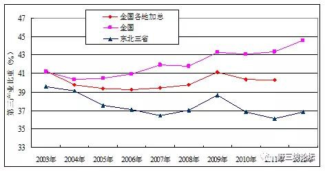 2003年到2012年,第三產(chǎn)業(yè)的比重與全國相比,東北地區(qū)差距進(jìn)一步拉大。
